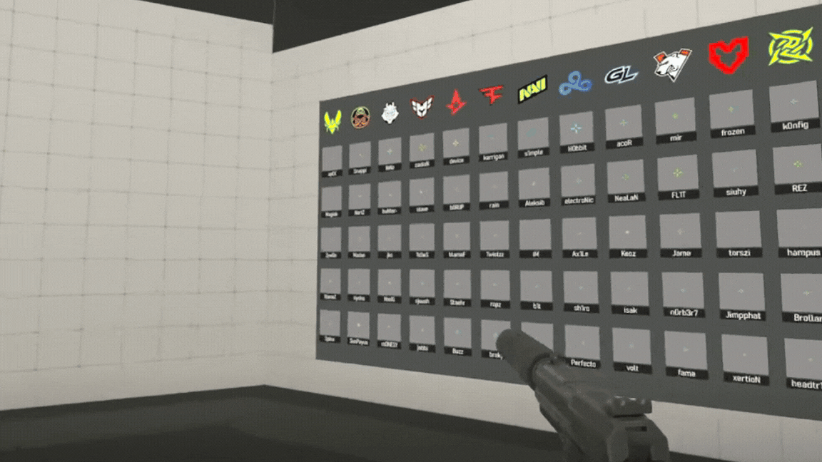 You can pick a pro player setup you like or the crosshair that looks the closest to what you’re looking for. Then, you can return to the other two boards and see the highlighted elements of those crosshairs. You are free to change whatever you want, so you can move, shoot, and even find out how the chosen color will look on different maps.