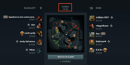 Turbo is a Dota 2 mode that is designed for faster games. Here, XP and gold gain are boosted, and buildings are "thinner" with less HP and buffs. In Turbo, heroes get stronger more quickly, which encourages faster pushes, given how easy the towers are to destroy. Because of that, the games usually last around 20 minutes. However, players tend to use Turbo games to try out the new builds they come up with, so the matches sometimes turn into 1h+ constant back-and-forth without a single thought of hitting buildings.