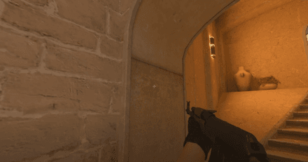 Эта точка находится на повороте после рампы, когда террористы уже начинают выход на мид через узкий проход. КТ занимает позицию за ящиком в углу и смотрит на выход теров. Благодаря углу обзора и хитрой геометрии CT почти не видно – только часть головы или ствол оружия. Зато он видит практически весь проход.